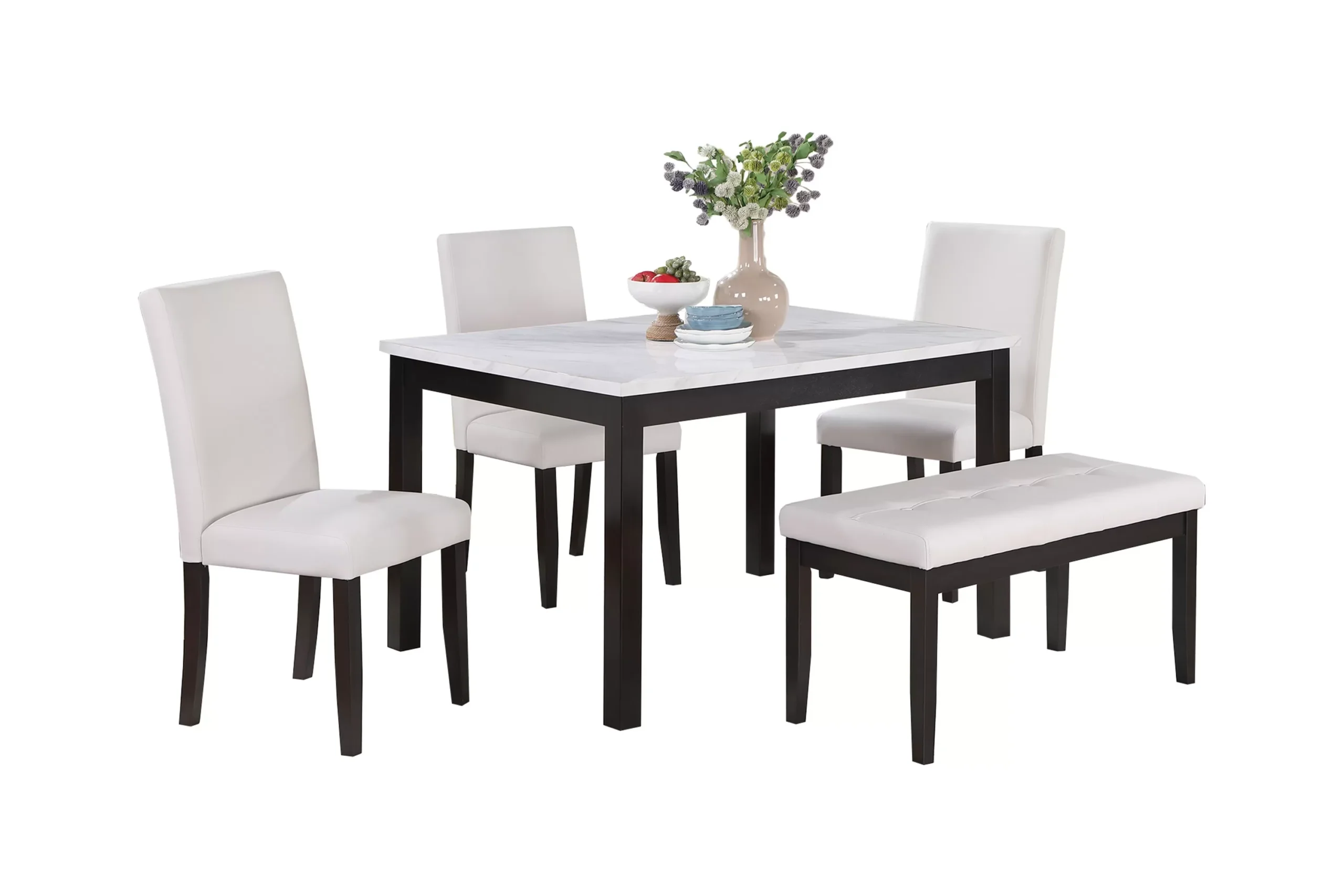 Este juego de comedor de 5 piezas presenta un diseño versátil que se adapta perfectamente a comedores abiertos, cocinas o incluso a espacios formales pequeños. En el centro se encuentra una mesa rectangular, elaborada con una llamativa cubierta de imitación mármol que aporta un aspecto elegante y pulido sin sobrecargar el espacio. Su acabado en dos tonos se integra fácilmente con una amplia variedad de estilos decorativos, desde tradicionales hasta modernos, convirtiéndolo en una opción adaptable para tu hogar.