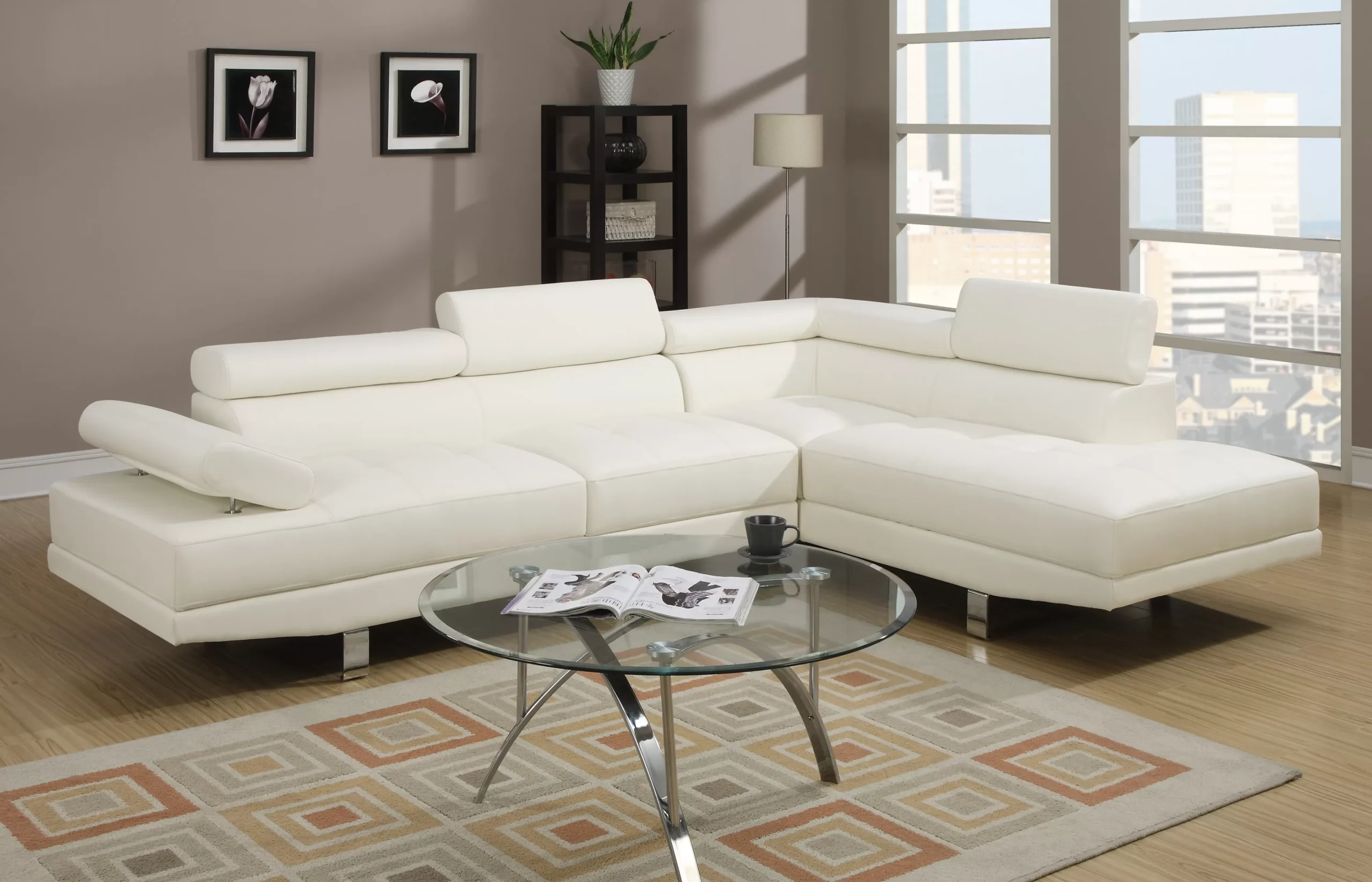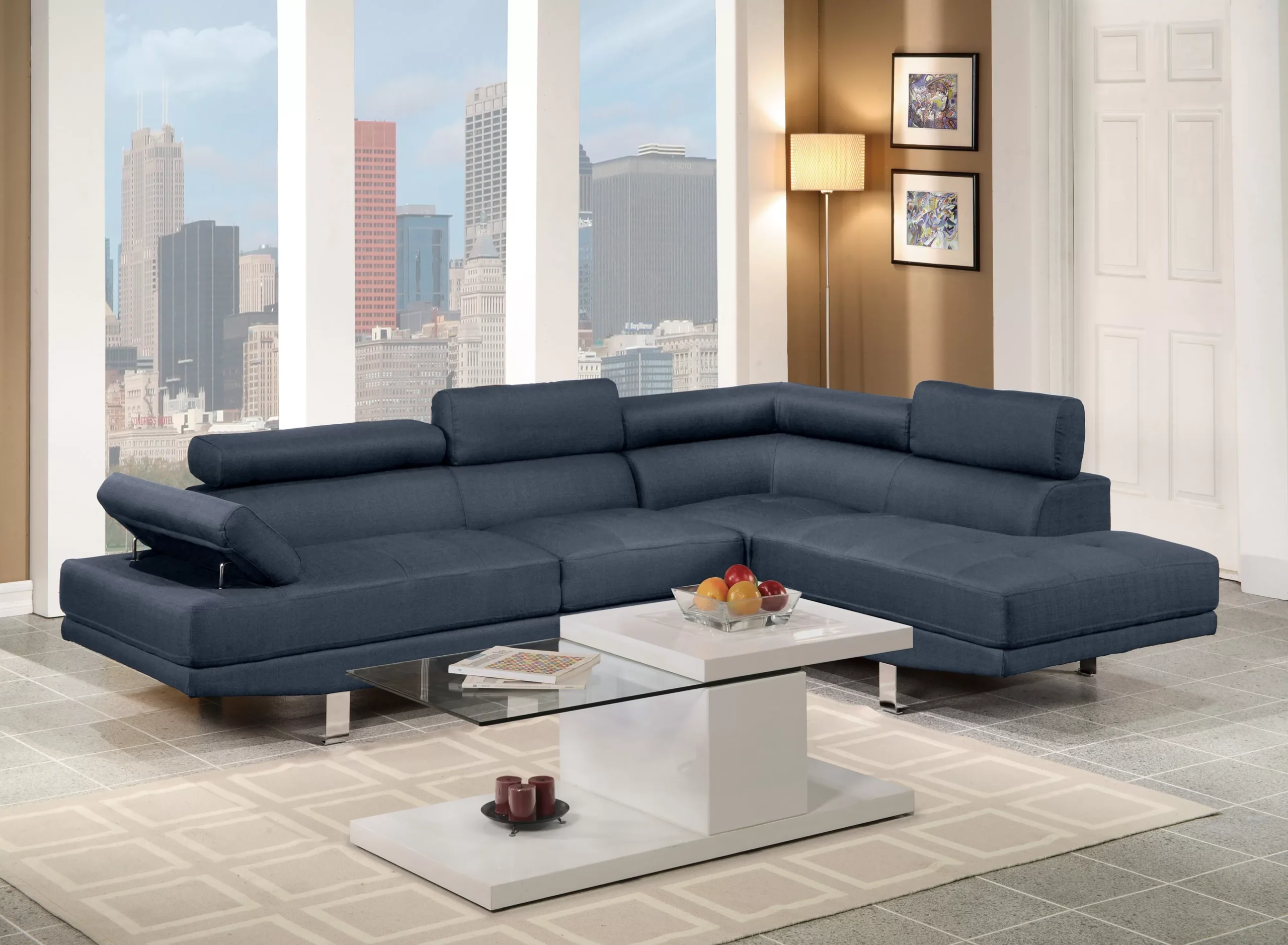 Seccional contemporáneo con patas metálicas, cojines capitonados, cabeceras y brazo ajustables, y chaise derecha. Diseño moderno y cómodo, disponible en piel sintética o tela tipo lino.