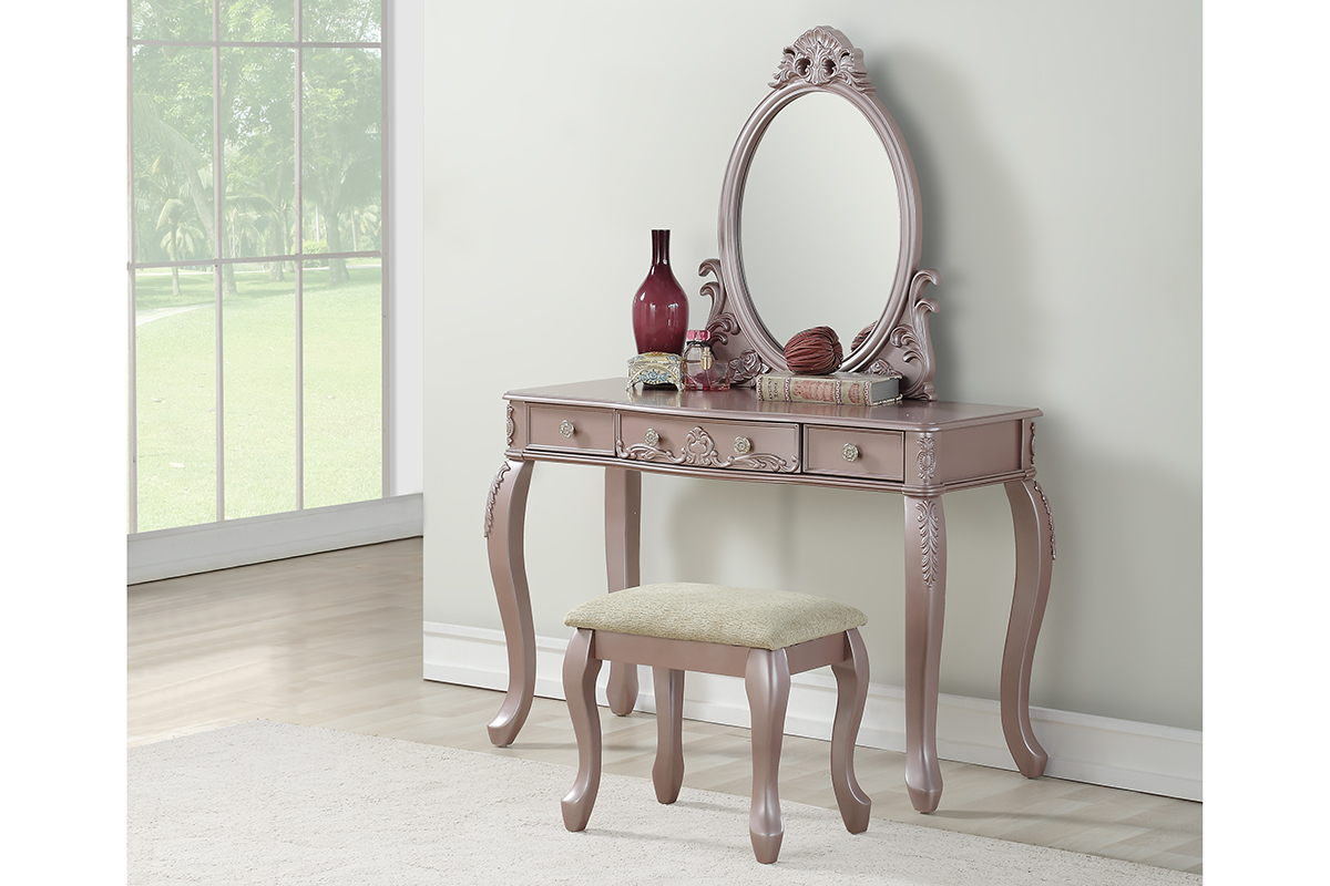 Este lujoso y clásico juego de tocador aporta el encanto a su espacio vital. El marco del espejo con forma de concha y volutas hace juego con los detalles de la mesa tallada para crear un aspecto vintage. Este conjunto de tocador también viene con un taburete a juego que crea comodidad mientras se maquilla o se riza el pelo. Disponible en oro rosa, blanco, champán y espresso.